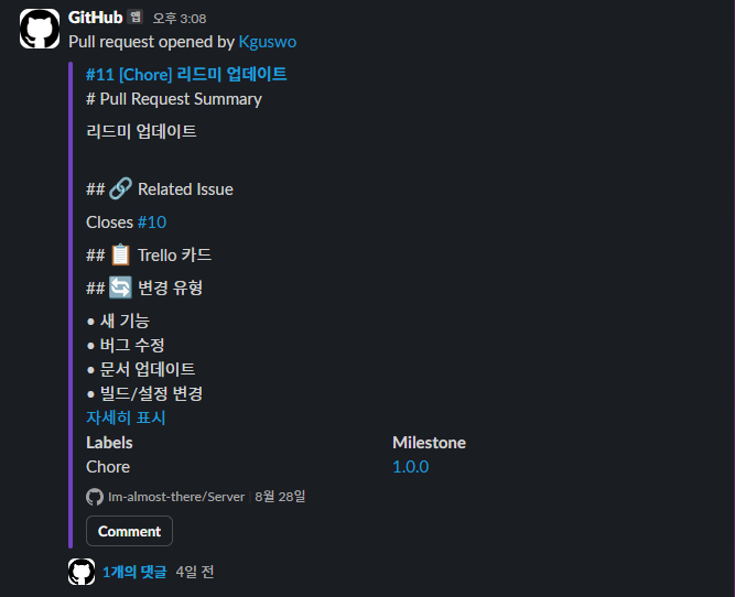 Discord나 Microsoft Teams도 있었지만, GitHub App의 연동 품질이 Slack이 가장 뛰어났다. 특히 팀 슬랙 채널에 PR, 이슈, 커밋 알림을 받아볼 수 있어 팀 전체가 프로젝트 진행상황을 실시간으로 공유할 수 있었다.