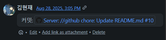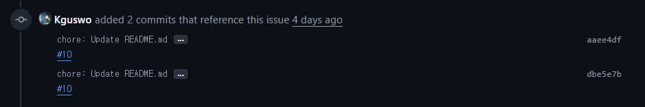 커밋 메시지에 이슈 번호를 포함하여 GitHub에서 자동으로 이슈와 커밋을 연결하도록 했다.