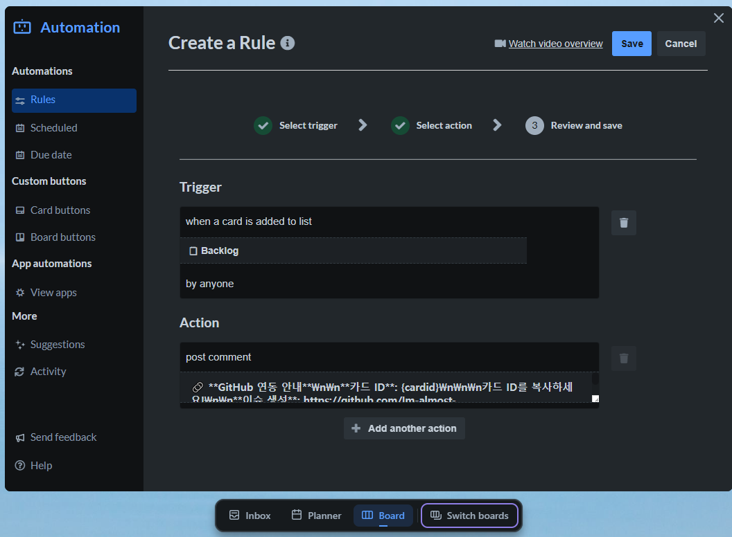 Jira나 Linear 같은 복잡한 도구 대신, 소규모 사이드 프로젝트에서는 간단하면서도 시각적인 관리가 필요했다. 특히 Automation Rules로 카드 생성시 GitHub 링크를 자동 생성할 수 있고, API가 잘 문서화되어 GitHub Actions와 연동하기 적합했다.