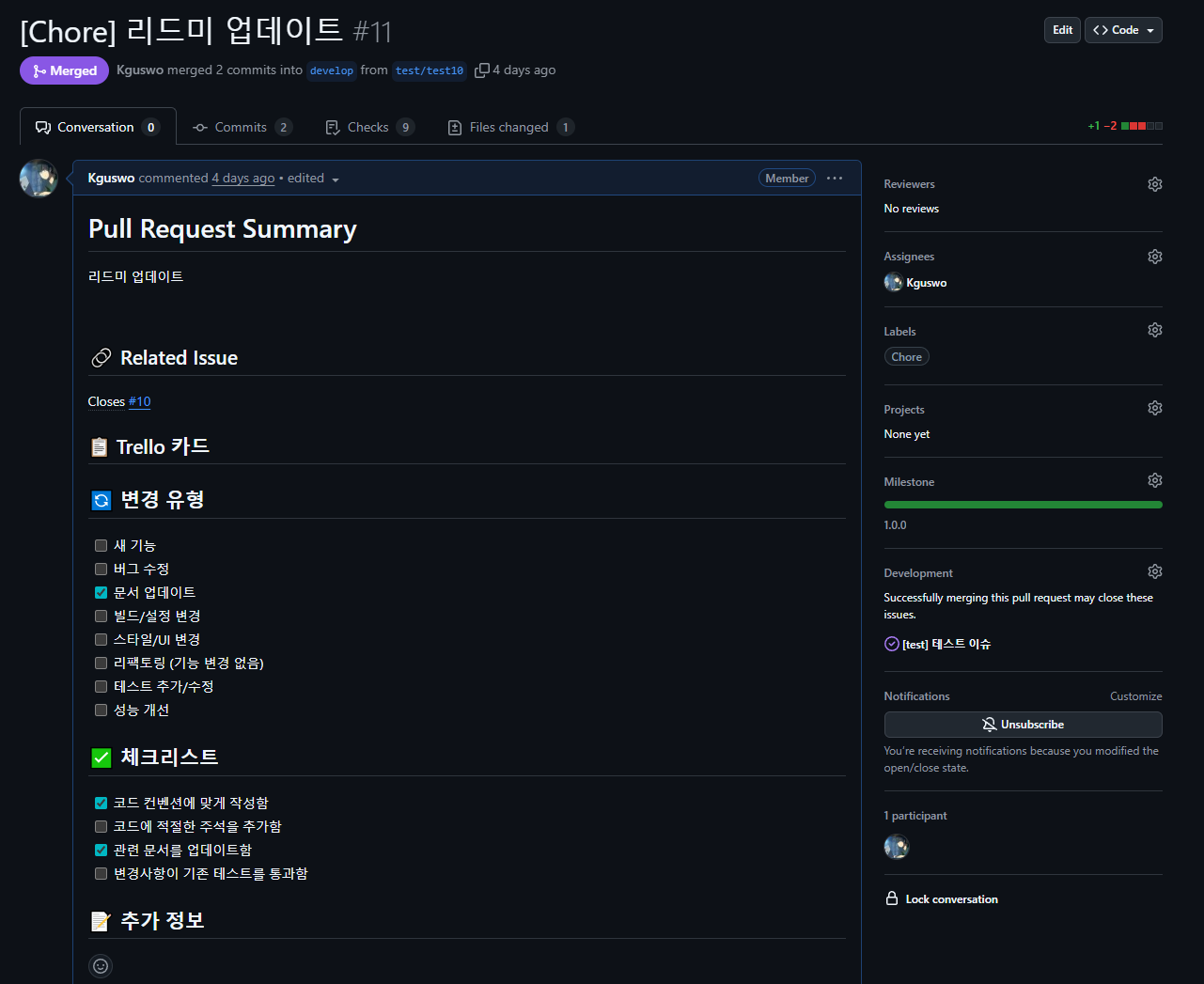 - Pull Request Review : 코드 리뷰 승인, 변경 요청 등