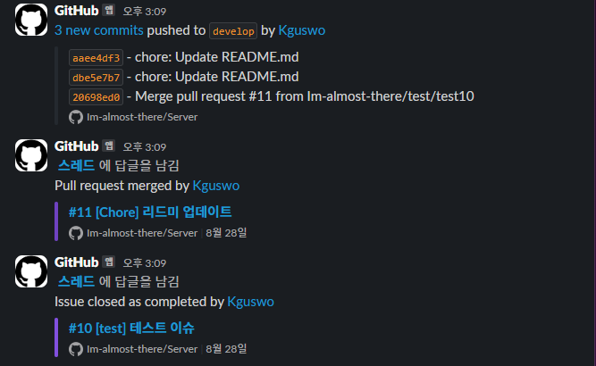 설정 완료 후 다음과 같은 알림들을 팀 슬랙 채널에서 받을 수 있다: