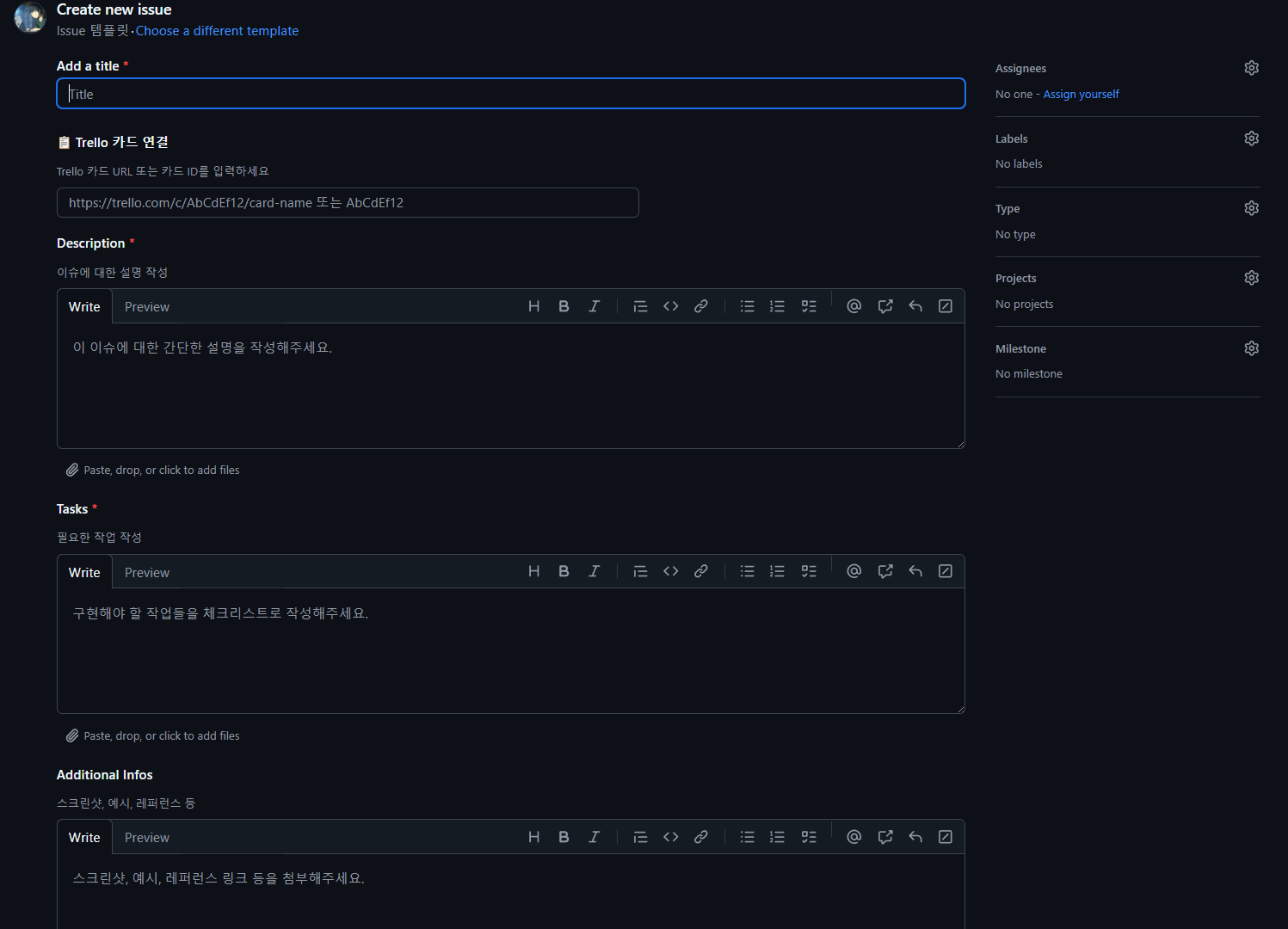 작업의 일관성을 위해 Issue 템플릿을 만들었다.