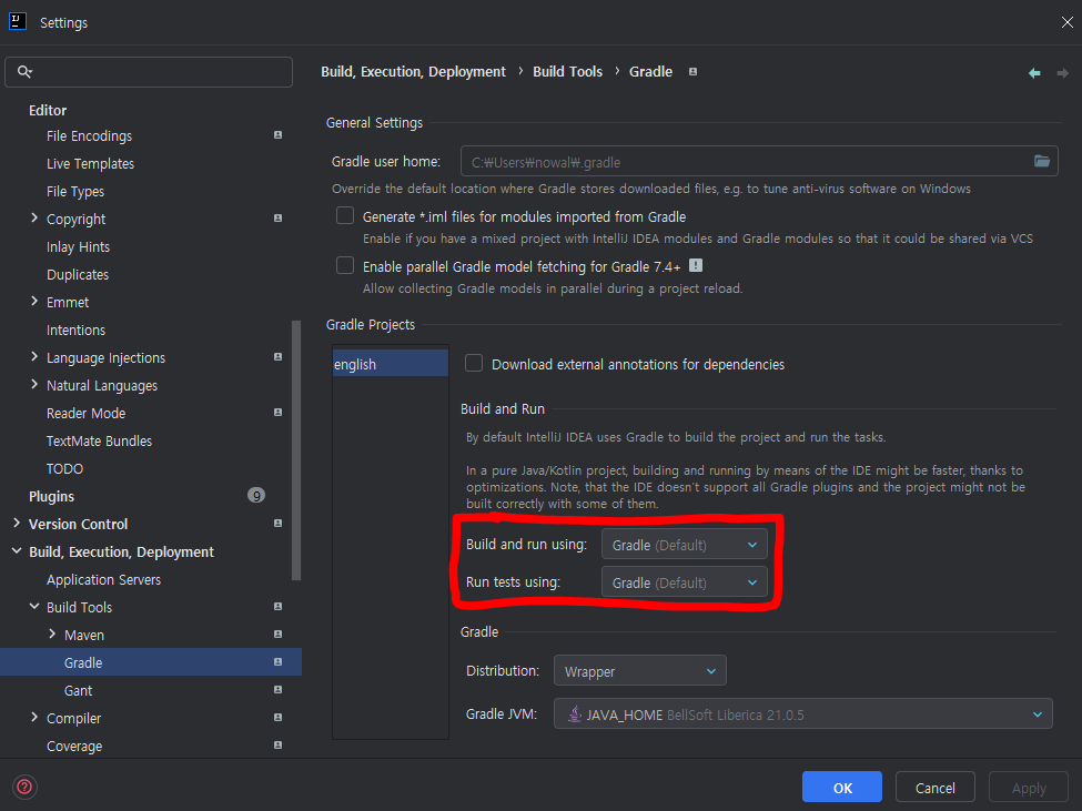 IntelliJ IDEA 설정에서 Build, Execution, Deployment > Build Tools > Gradle 항목을 열어, “Build and run using” 과 “Run tests using” 설정을 ‘IntelliJ IDEA’로 변경한다.