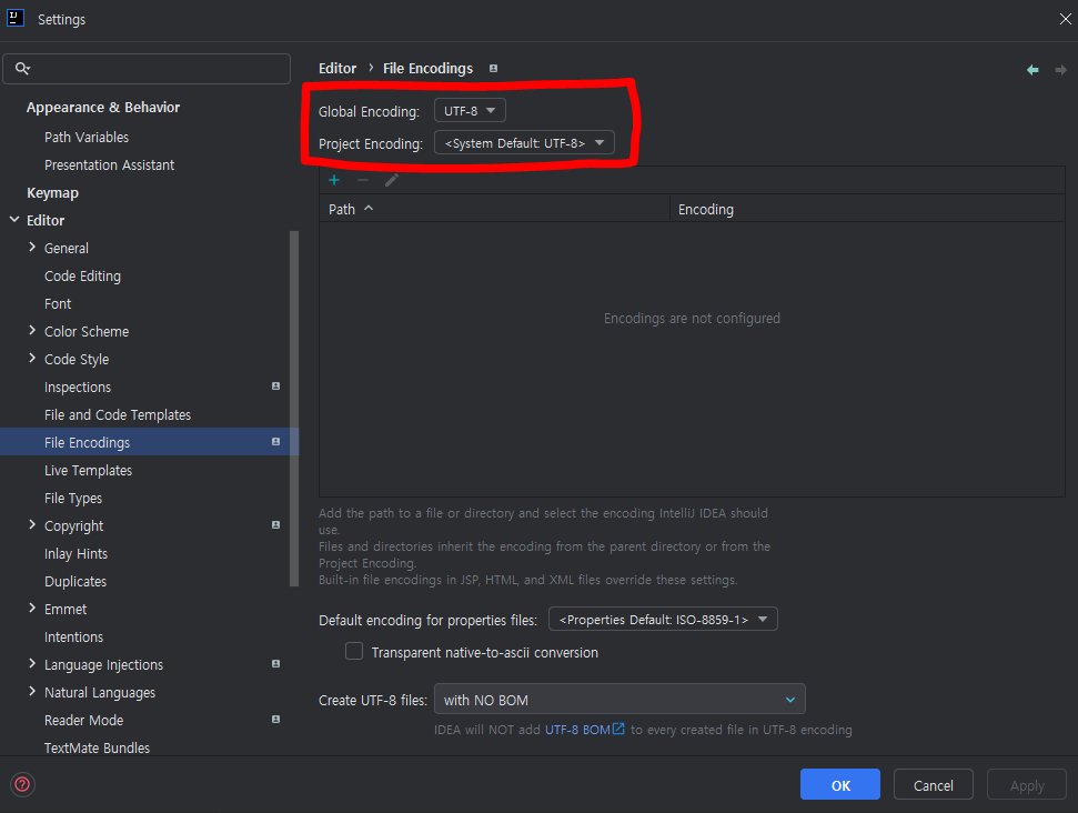 IntelliJ IDEA 설정에서 코드 스타일 > 파일 인코딩 > 인코딩을 UTF-8
