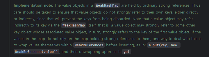 값 객체는 일반적인 강한 참조(Strong Reference) 로 유지되므로, 값 객체가 자신의 키를 직간접적으로 강하게 참조하면 키가 회수되지 않아 메모리 누수가 발생할 수 있다.