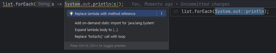 최신 IDE들은 람다와 메서드 참조 사이의 변환을 자동으로 제안한다.