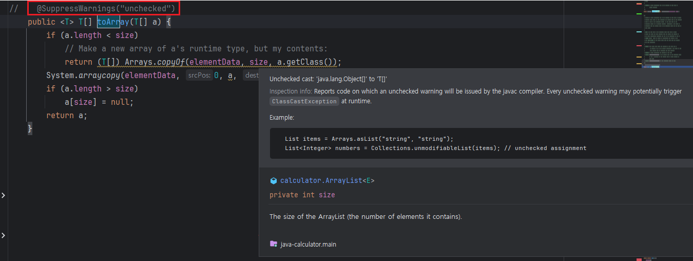 경고가 사라졌다. 이 코드는 깔끔하게 컴파일되고 비검사 경고를 숨기는 범위도 최소로 좁혔다.