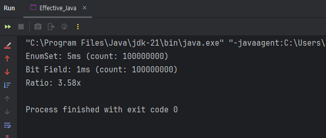 EnumSet이 비트 필드보다 약간 느린 것은 사실이다. 그러나 이 차이는 매우 미미 하며, 대부분의 애플리케이션에서는 전혀 문제가 되지 않는다.