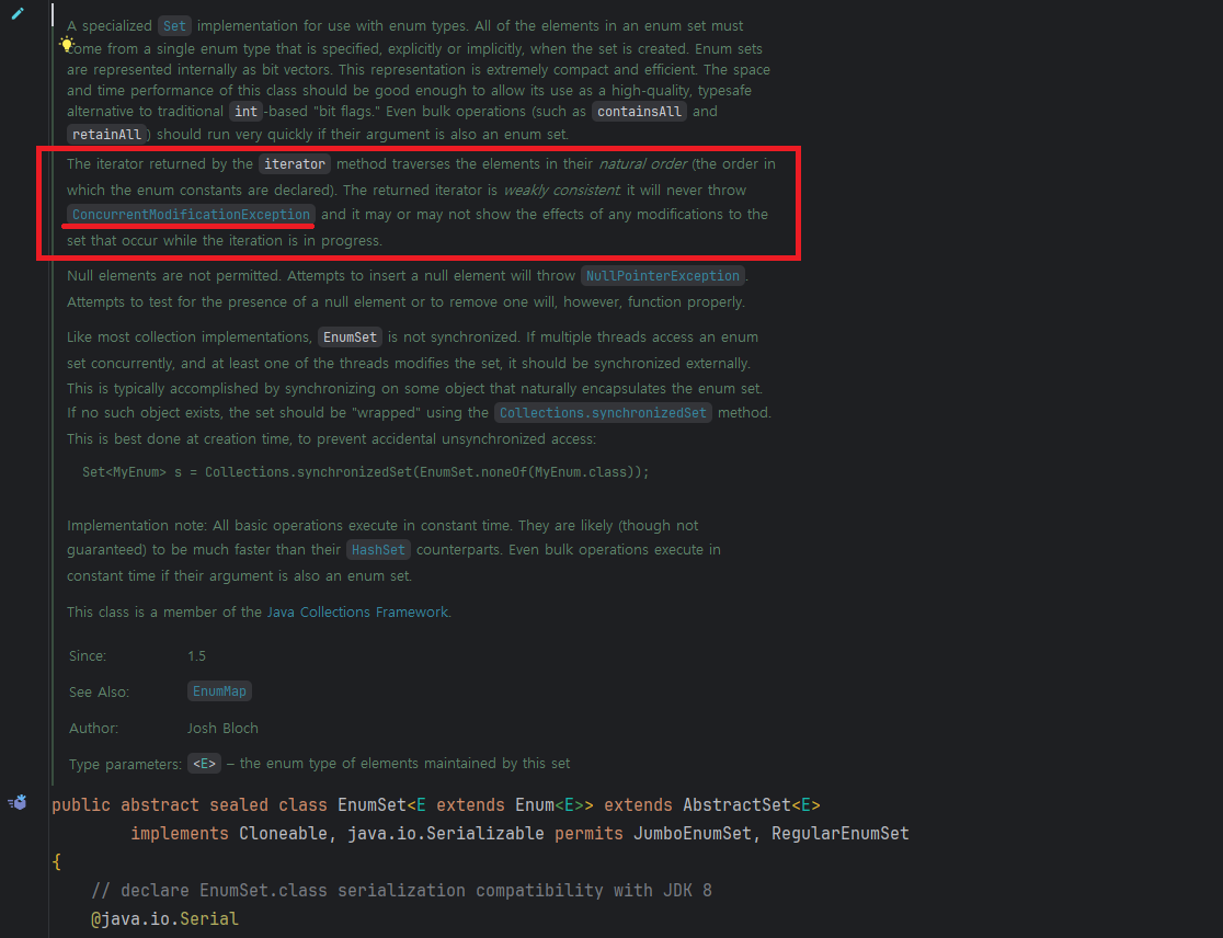 EnumSet 자체는 직렬화 가능하지만, 역직렬화 시 구체적인 구현 클래스(RegularEnumSet 또는 JumboEnumSet)가 달라질 수 있다. 따라서 직렬화된 형태에 의존하는 코드는 작성하지 말아야 한다.