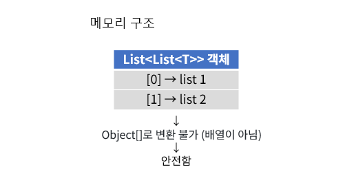 List<List<T>>객체 → 배열이 아니므로 공변성 문제 없음 → 안전