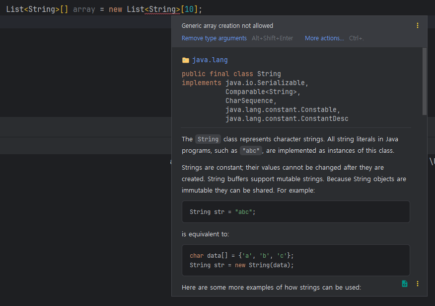 문제는 여기서 발생한다. 실체화 불가 타입으로 varargs 매개변수를 선언하면, 즉 제네릭 타입의 가변인수를 사용하면 배열을 생성하는데, 제네릭 배열 생성은 본래 불가능해야 한다.