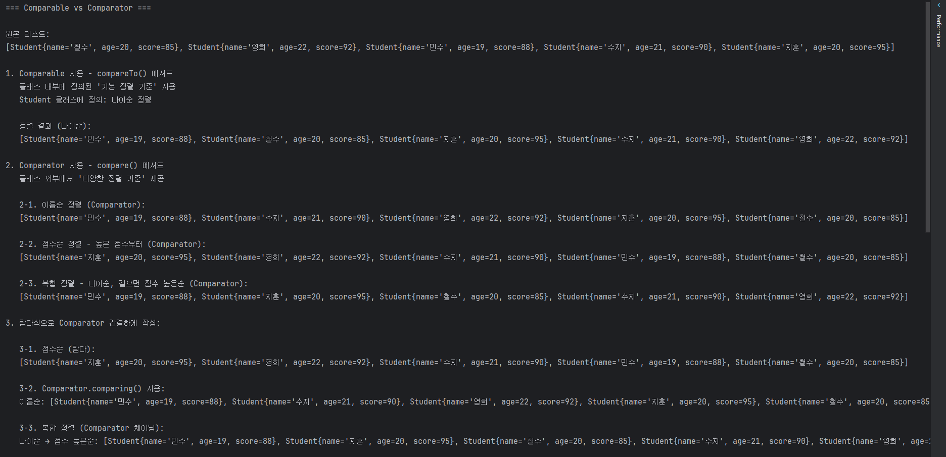 System.out.println(" → Comparator: 상황에 따라 '다른 기준'으로 정렬하고 싶을 때");