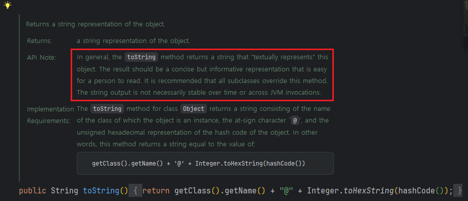 핵심은 간결하면서 사람이 읽기 쉬운 형태의 유익한 정보 를 반환해야 한다는 것이다. 또한 모든 하위 클래스에서 이 메서드를 재정의할것을 권장한다.